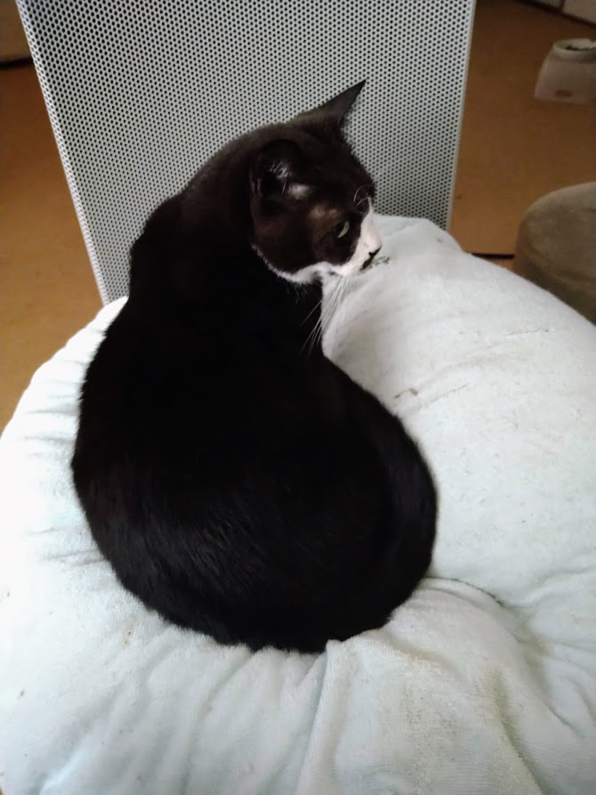 彼が行動範囲を広げきれていないのは、単に、アタゴロウを警戒して近寄らないようにしているだけなのだ。アタゴロウ愛用のベッドやクッションにはさすがに触れないが、部屋の中の様々な場所は、アタゴロウがいない隙を見計らって、少しずつ探検している。アタゴロウと距離を置きながら、窓際で日向ぼっこするようになるのも、時間の問題だろう。(ヒーターの前は狭いのでしばらく無理かもしれない。)