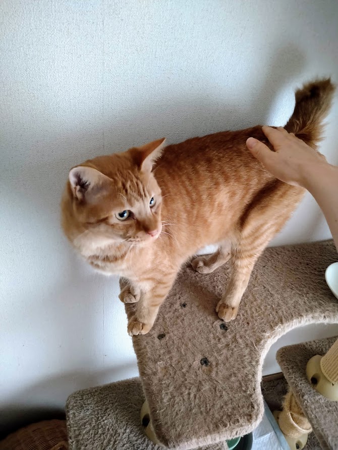 先日、ステップに立っている彼を撫でていたら、茶トラくんは、自分から私のみぞおちの辺りに頭を擦りつけてきたものである。