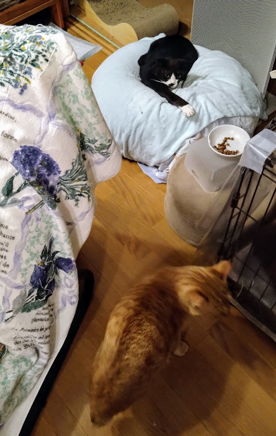 もとより、二匹を交互に撫でて匂いの交換に努めてきたものであるが、常に「されるがまま」のアタゴロウに対し、手を出すととりあえず頭を引っ込める(だが、撫で始めるとむしろ首を伸ばしてくる)茶トラくんは、ただ撫でるのにも時間と手間がかかる。