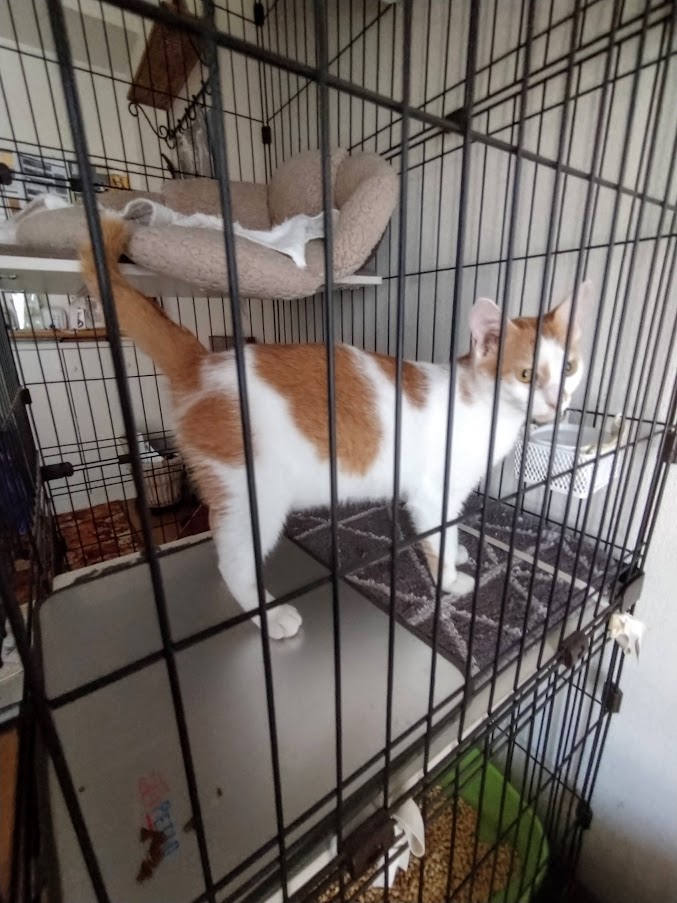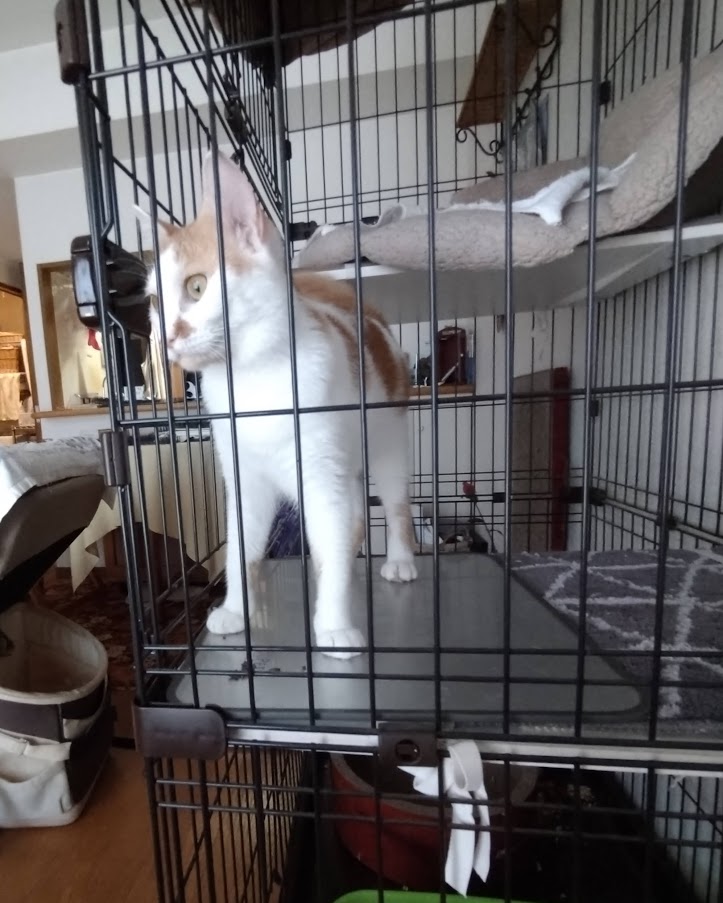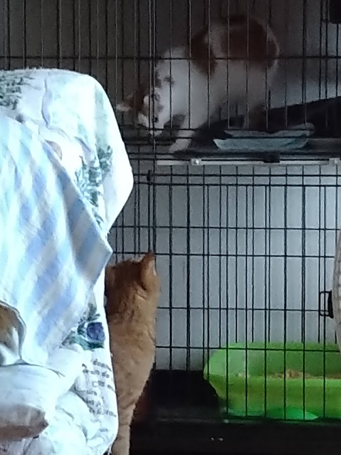 だが、彼女も、遠くから私が起きたことを察したらしい。寝起きの、ほぼ何も見えない裸眼でぼんやり眺めていると、やがて猫とおぼしき影がケージの四階から現れ、ちょっとしゃがれた声で短く鳴きながら、ケージの中をせわしなく上下運動しているらしき気配が見て取れた。
